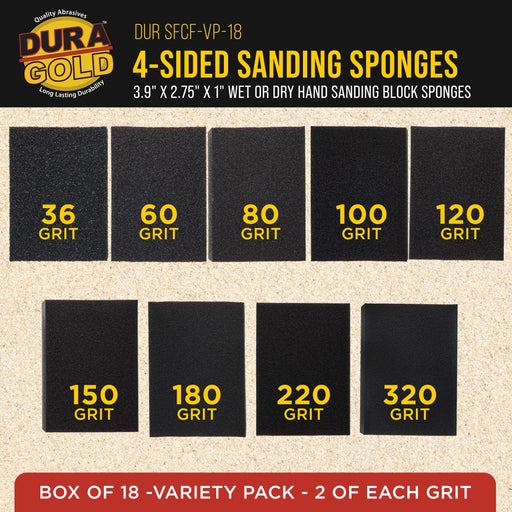 9 Grit Variety Pack Box of 18 Dura-Gold Performance Flex 4-Sided Hand Sanding Block Sponges that are 3.9" Long x 2.75" Wide x 1" Thick. The variet...