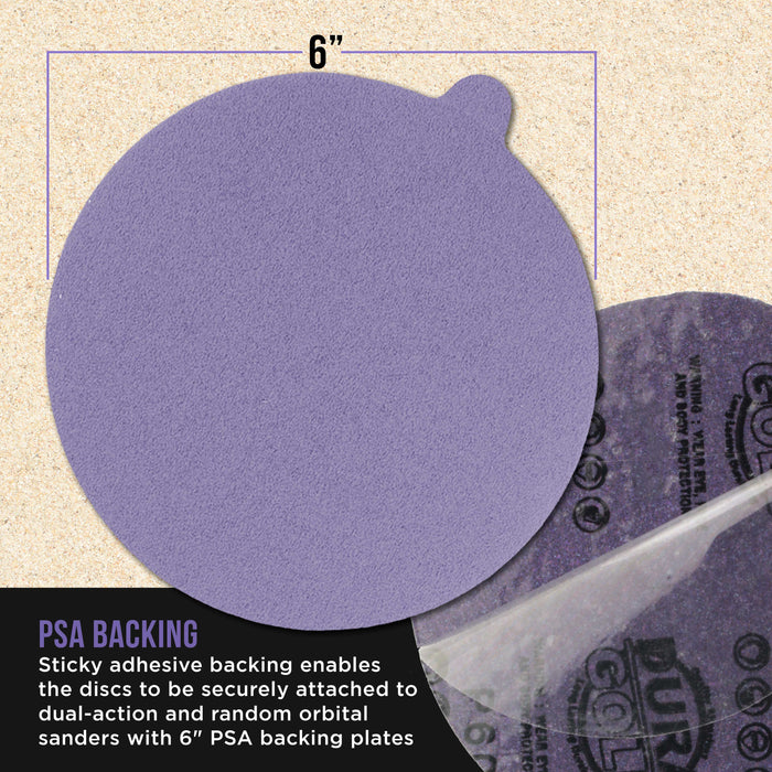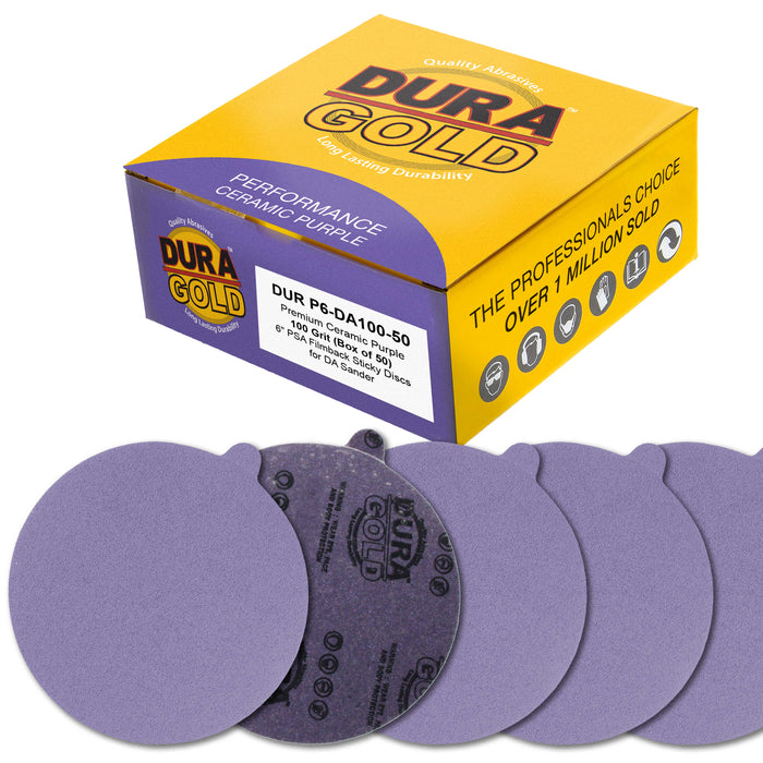 - Box of 50 Dura-Gold Premium 6" 100 Grit PSA Purple Film Ceramic Sanding Discs. These high-performance film-backed sanding discs have an easy-to-peel-off backing layer that protects the disc's PSA pressure-sensitive adhesive from getting contaminated. The sticky adhesive backing enables the discs to be quickly and securely attached to dual-action and random orbital sanders with 6" PSA backing plates.
